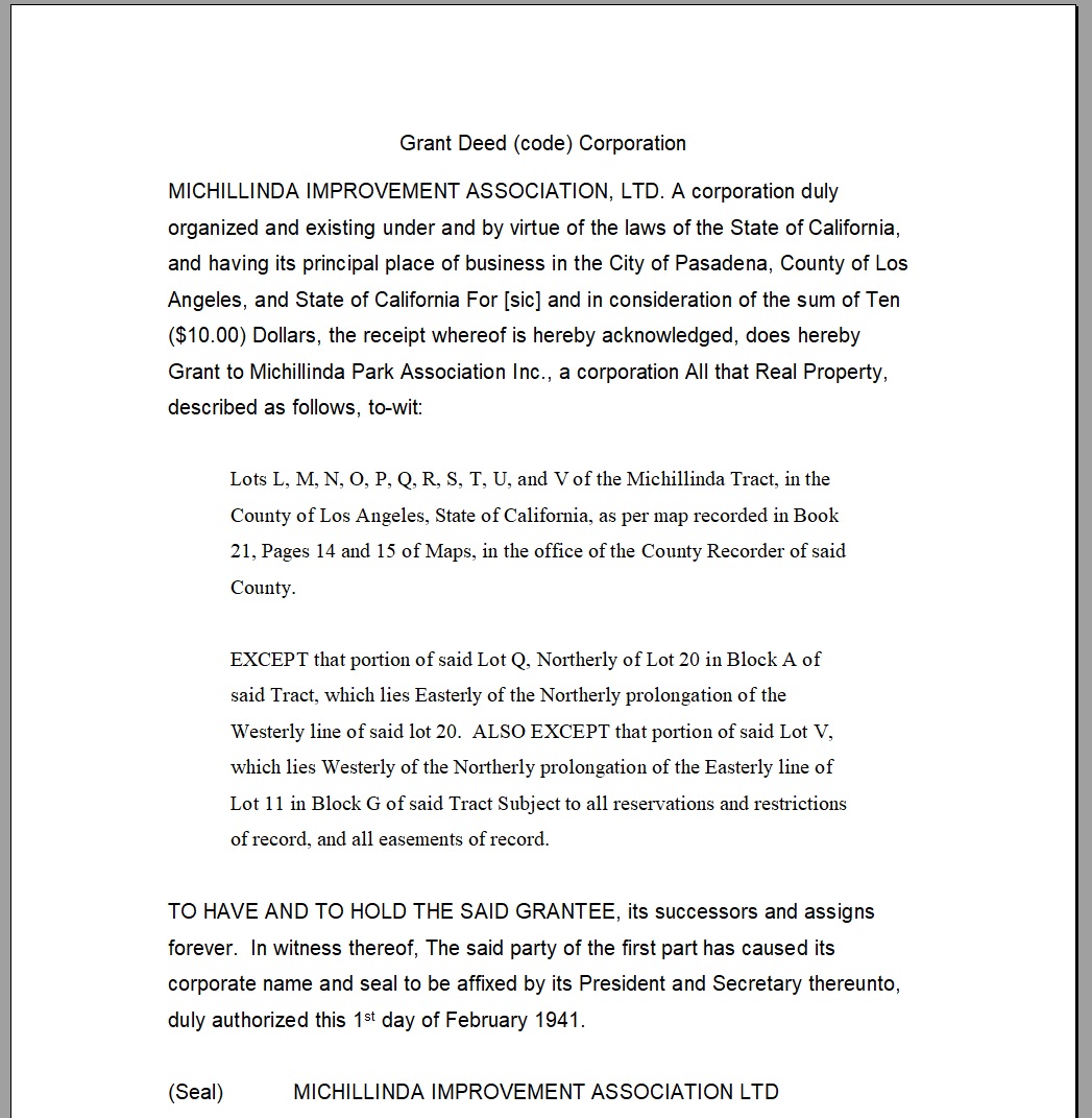 Original Document Source: Michillinda Park Association