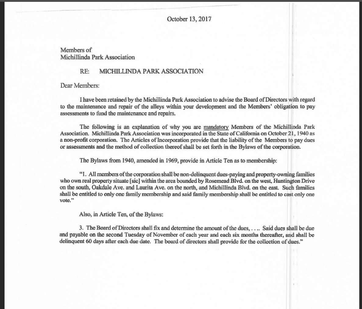 In October 2017 the MPA provided a legal opinion to potential Members. The opinion is not signed and makes assertions which appear to contradict the Articles and the By-laws, and thus has raised questions among lot owners.