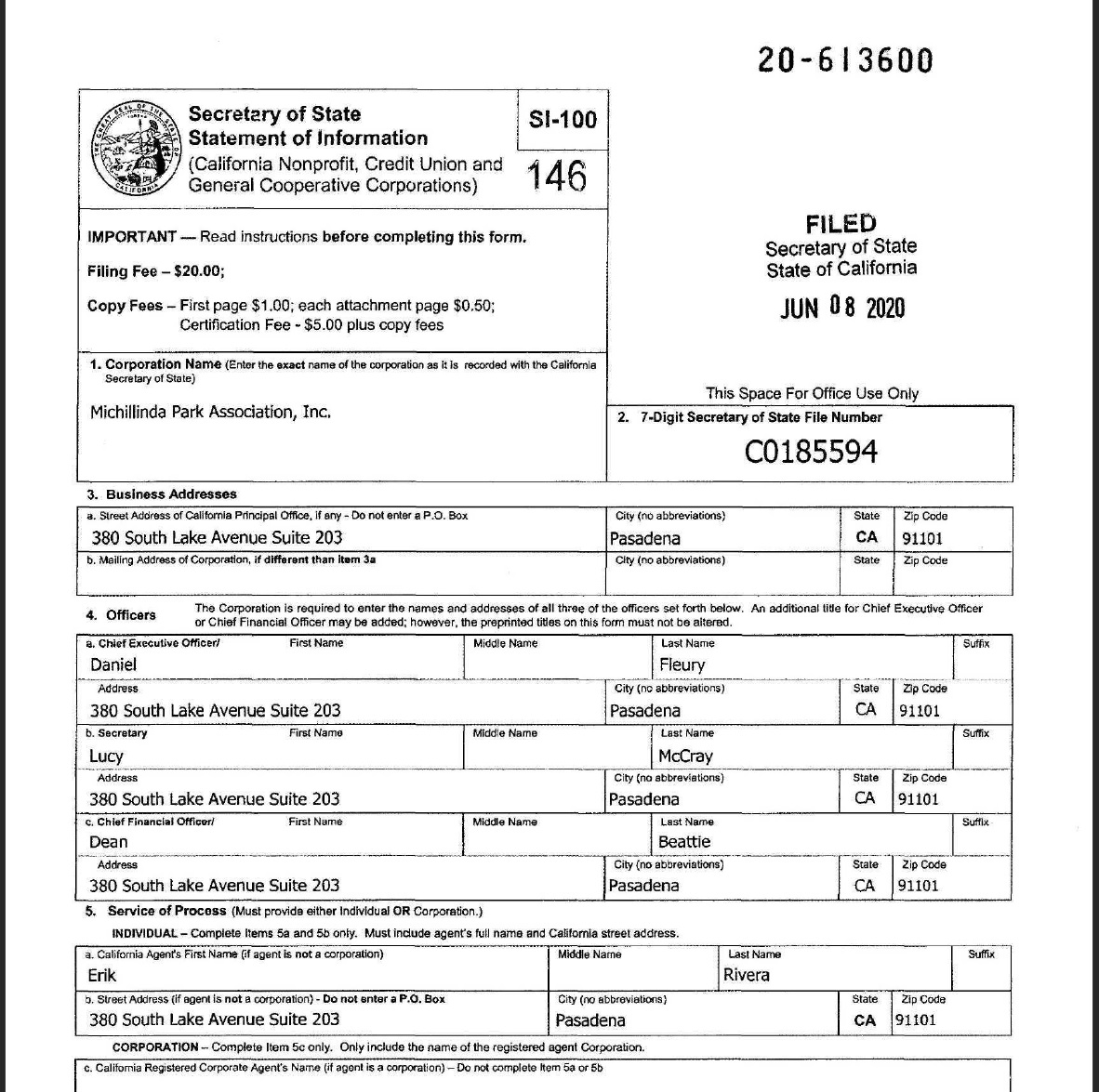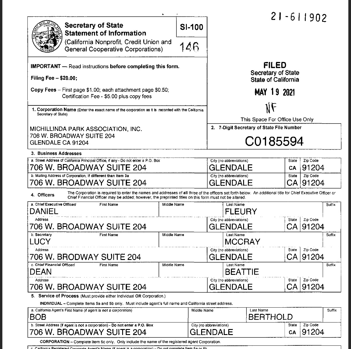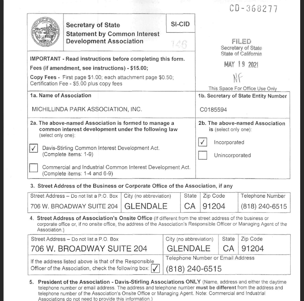 In May 2021, MPA recorded a new Statement of Information, as well as a Common Interest Development Statement indicating Michillinda Park as a "Condominium Project."