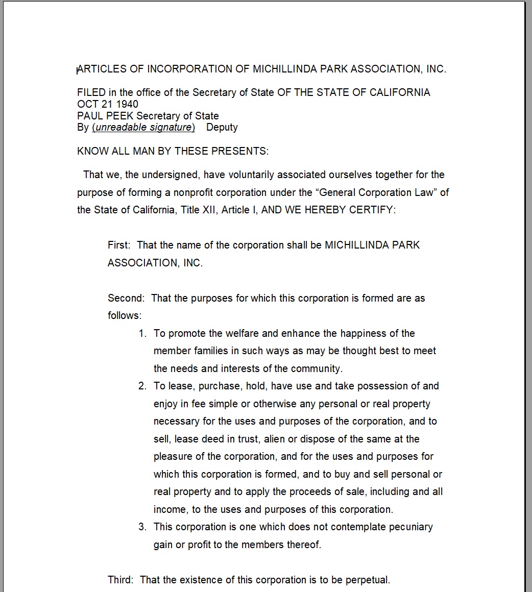 Michillinda Park Association Articles Of Incorporation, Oct 1940